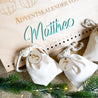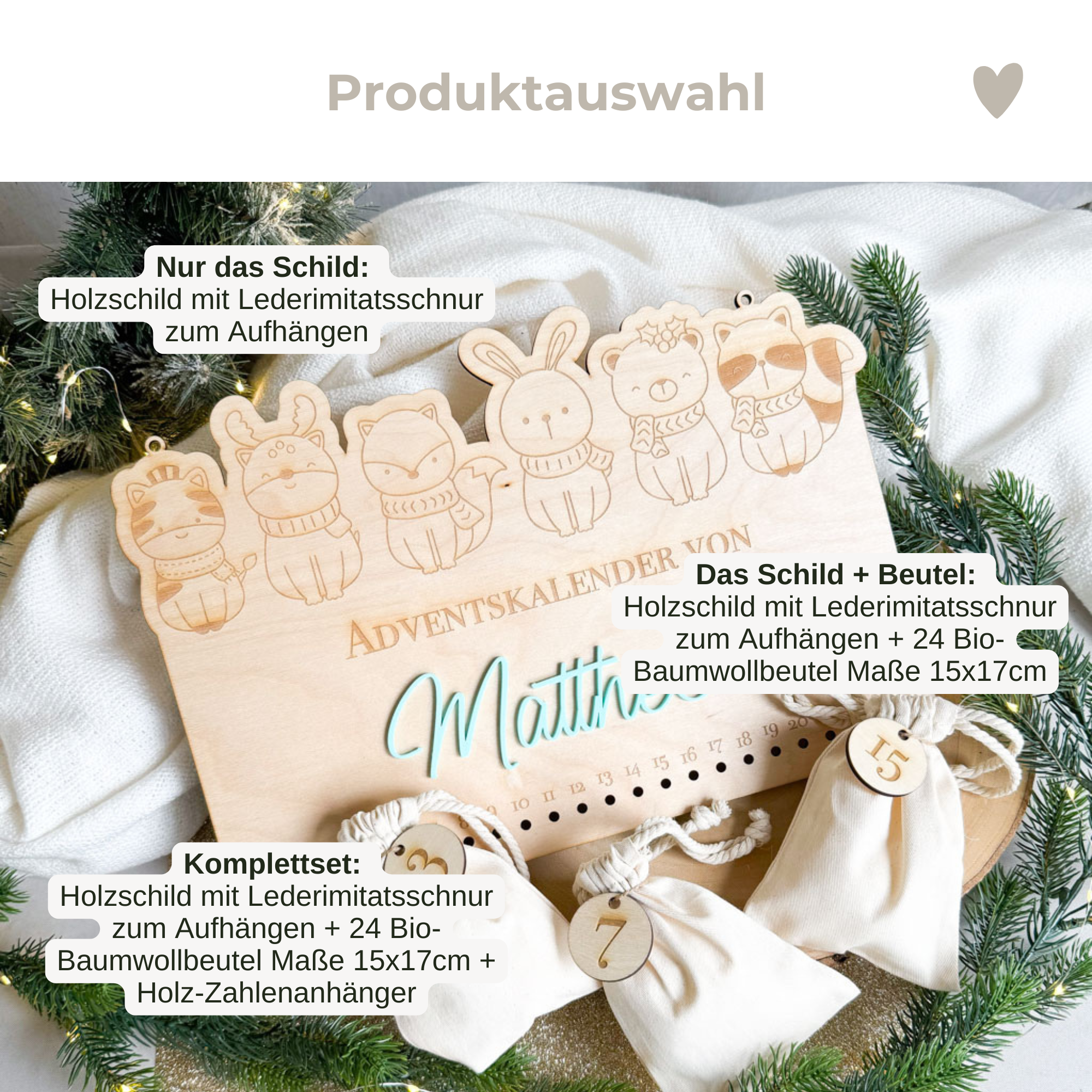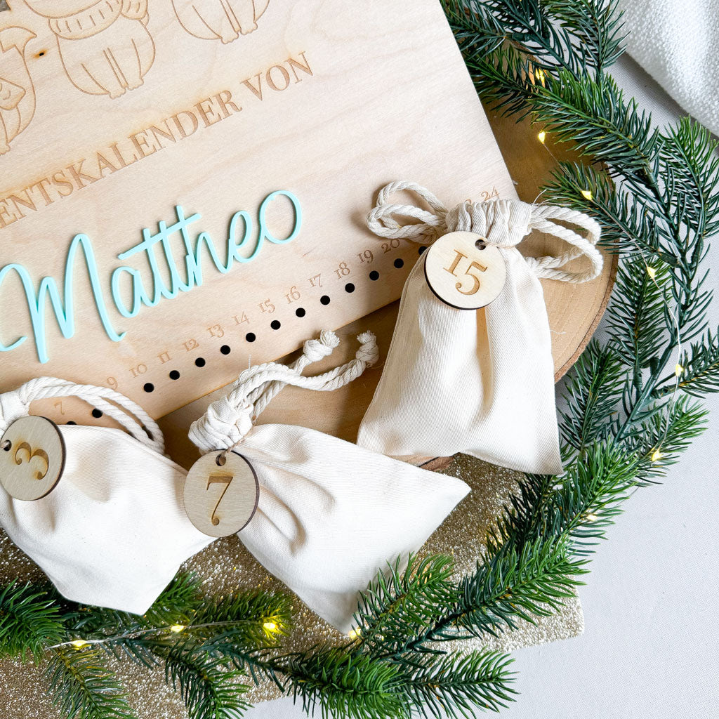 - Komplettset – Holzschild, Bio-Baumwollbeutel und liebevoll gefertigte Holz-Zahlenanhänger für ein rundum fertiges Adventskalender-Erlebnis.