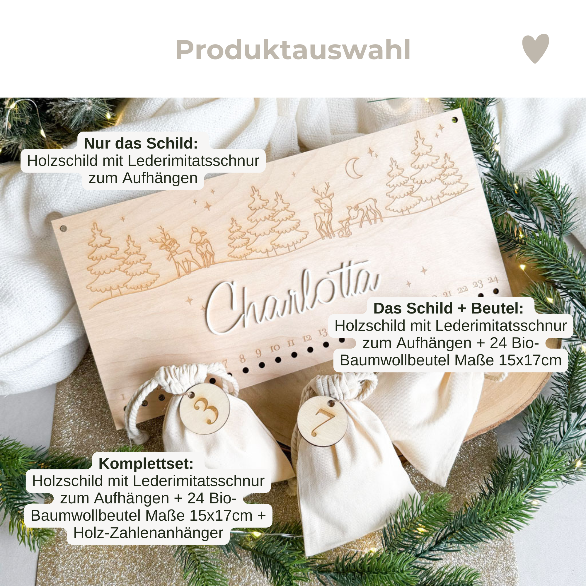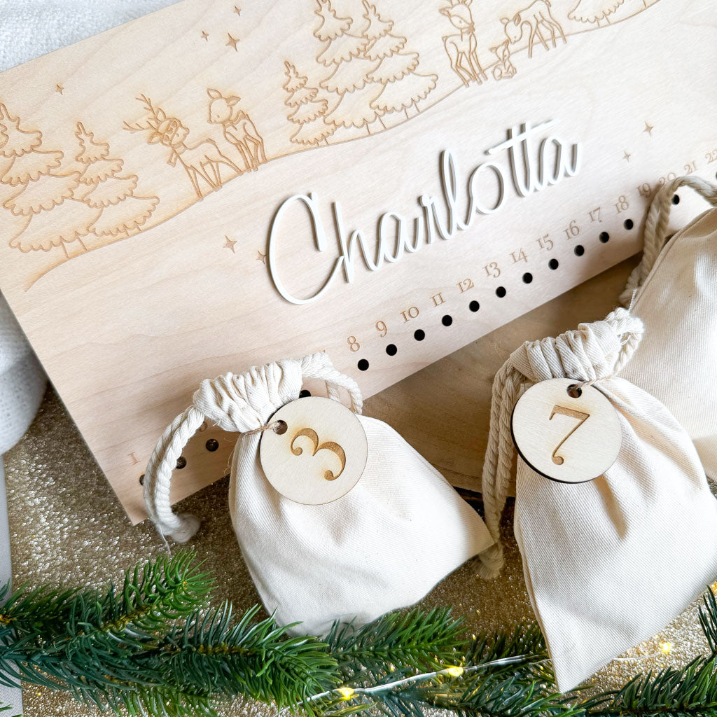 - Komplettset – Holzschild, Bio-Baumwollbeutel und liebevoll gefertigte Holz-Zahlenanhänger für ein rundum fertiges Adventskalender-Erlebnis.