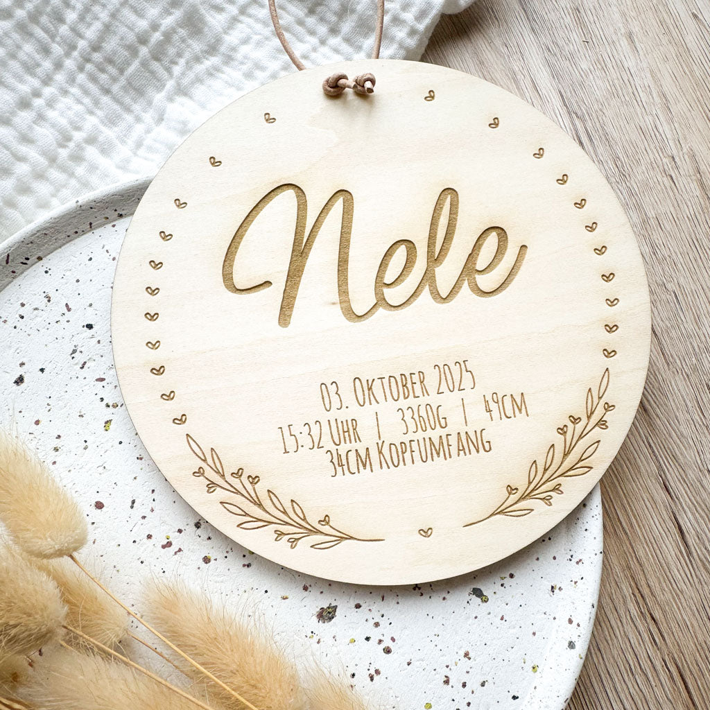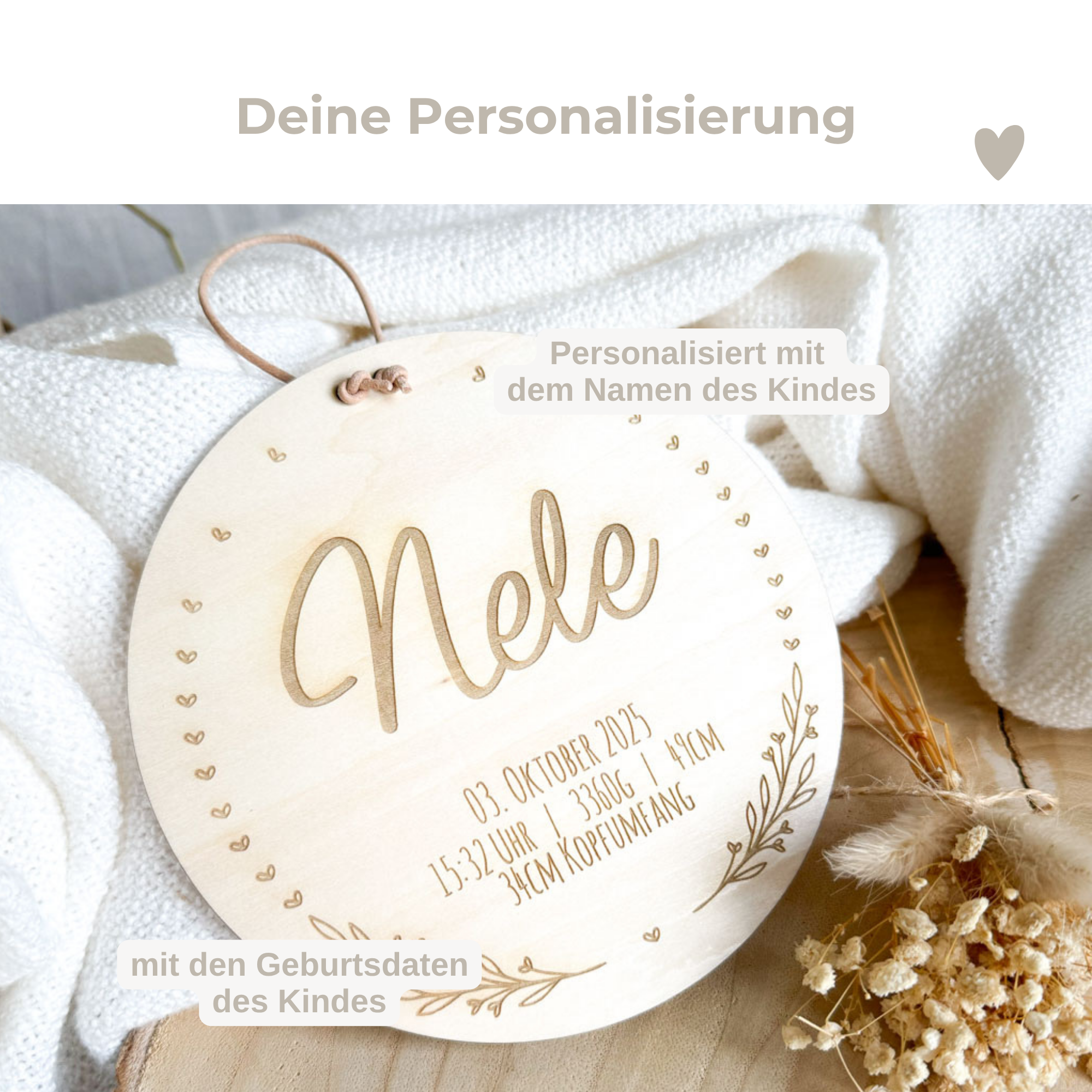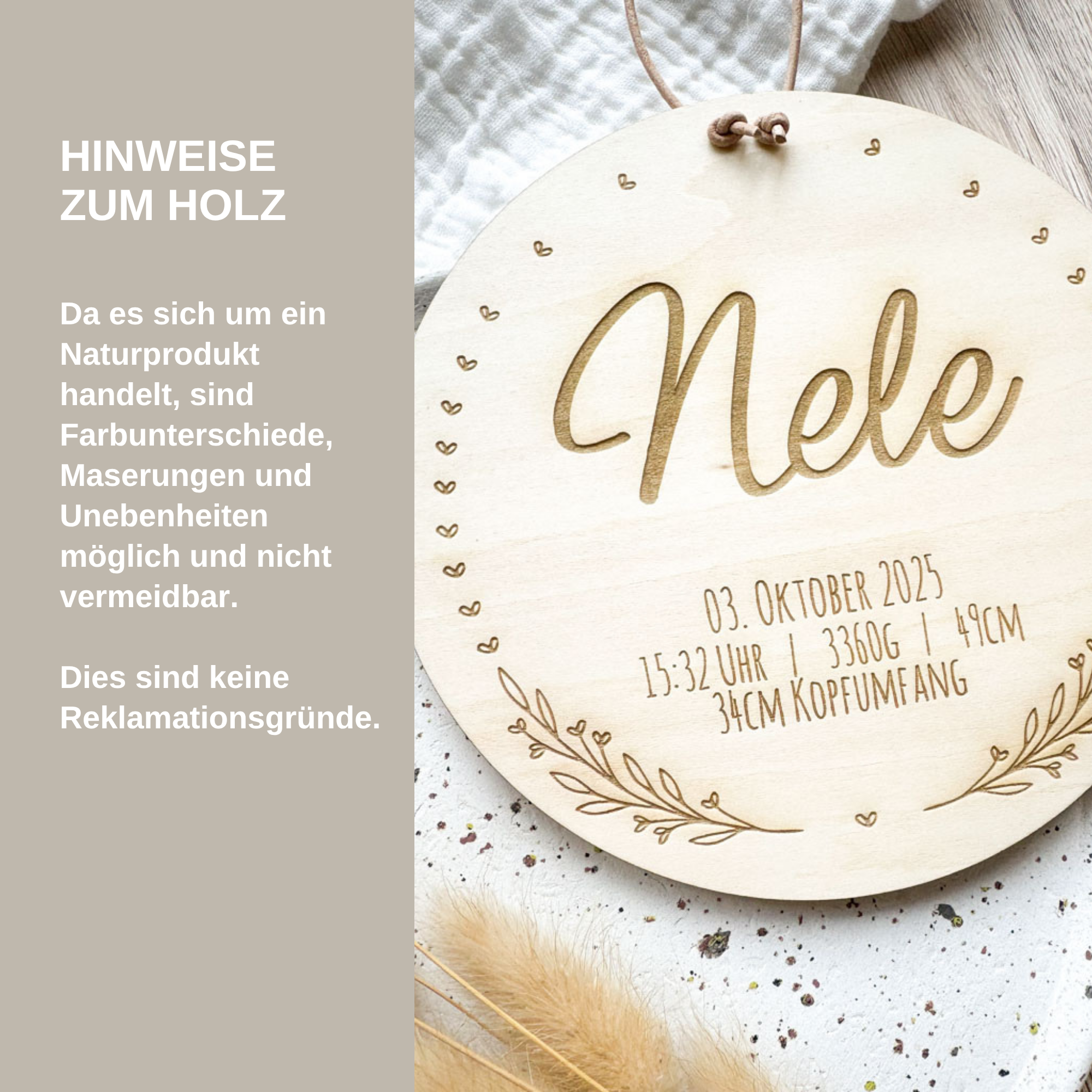 Das Geburtsschild ist ein Dekorationsartikel und kein Spielzeug. Da Holz ein Naturprodukt ist, können Maserung, Farbe und Gravur leicht variieren – genau diese Eigenschaften machen jedes Stück zu etwas ganz Besonderem.
