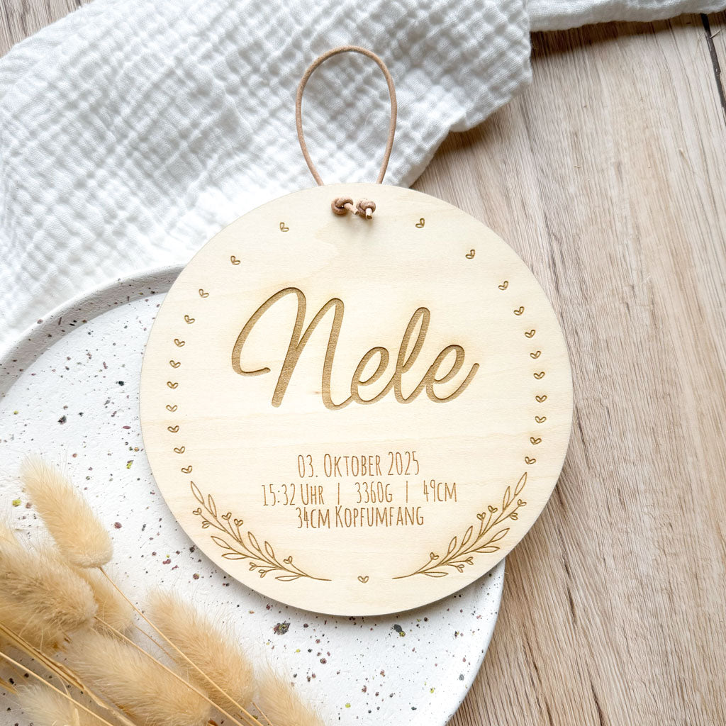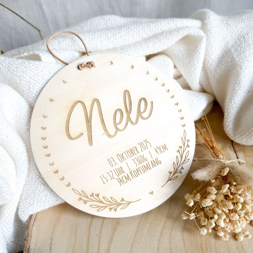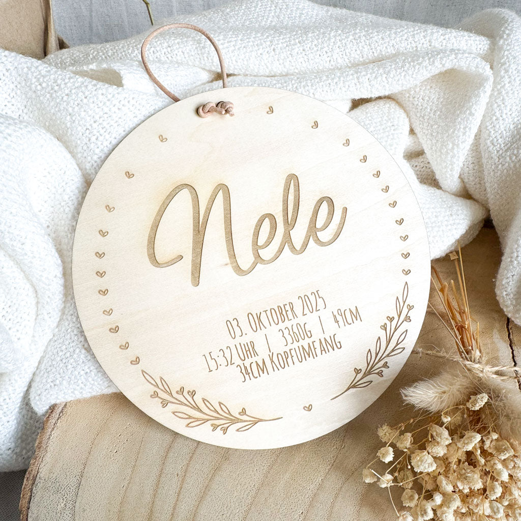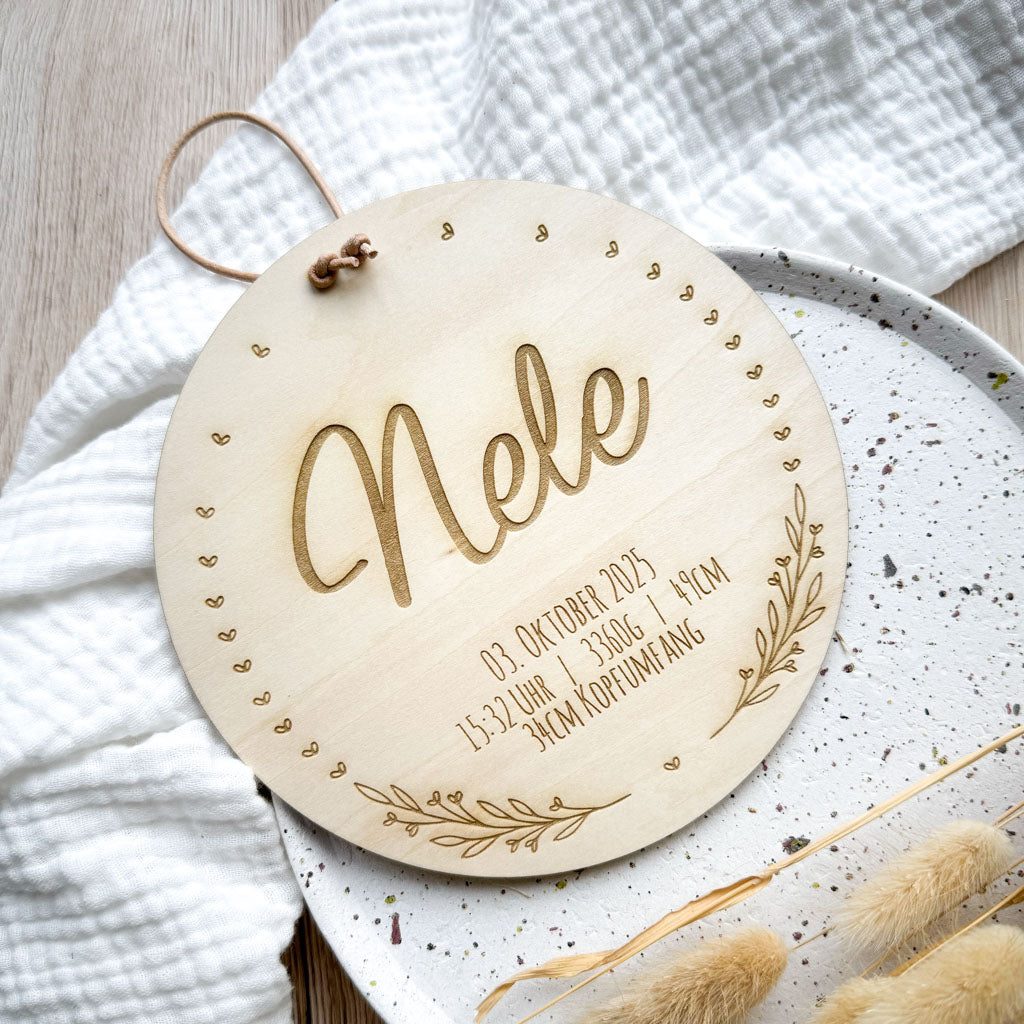 Das Geburtsschild ist ein Dekorationsartikel und kein Spielzeug. Da Holz ein Naturprodukt ist, können Maserung, Farbe und Gravur leicht variieren – genau diese Eigenschaften machen jedes Stück zu etwas ganz Besonderem.