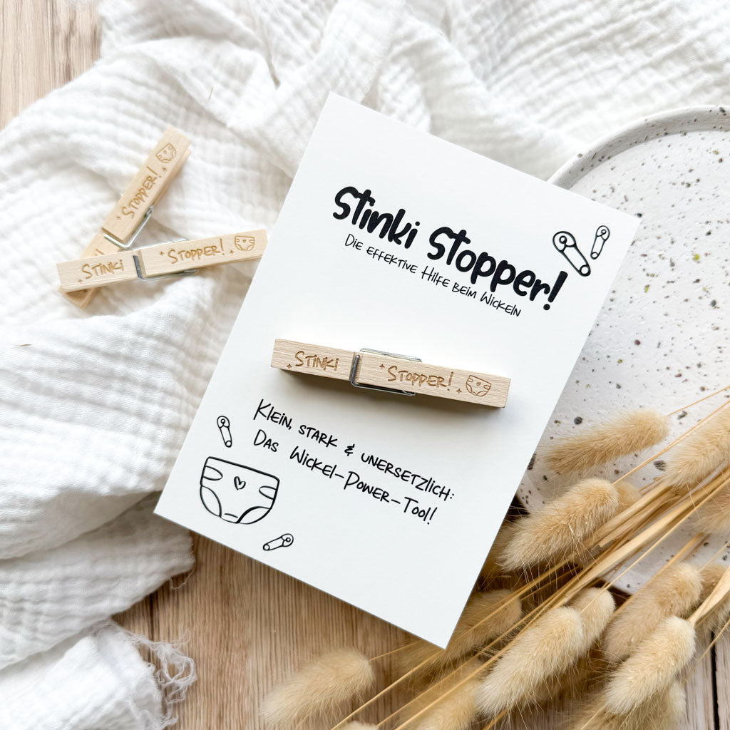 Der Stinki Stopper, eine gravierte Holzklammer, ist die witzige Wickelhilfe, wenn’s mal wieder streng riecht – unverzichtbar für alle Eltern mit Humor.
