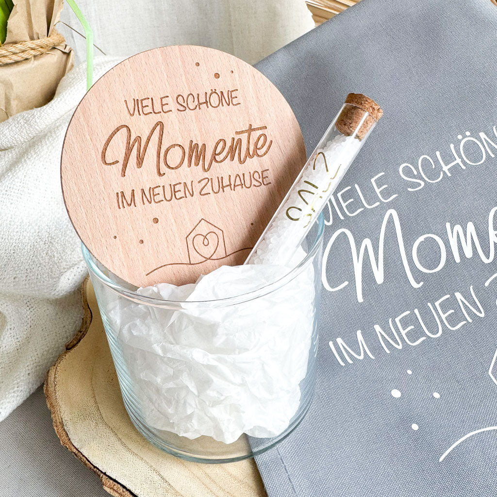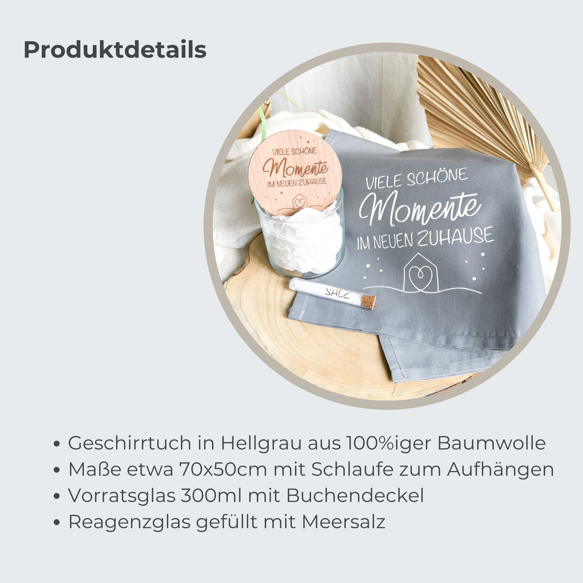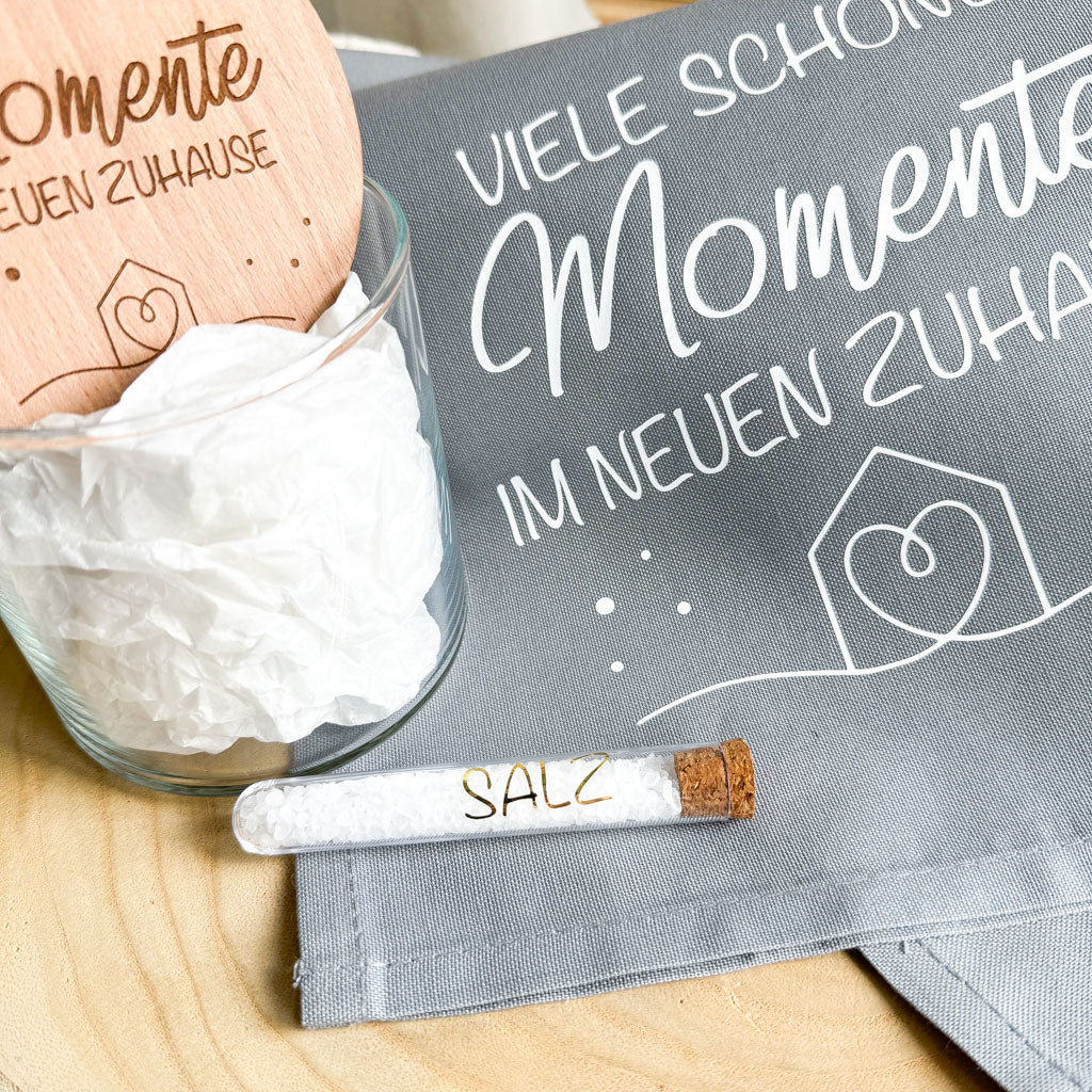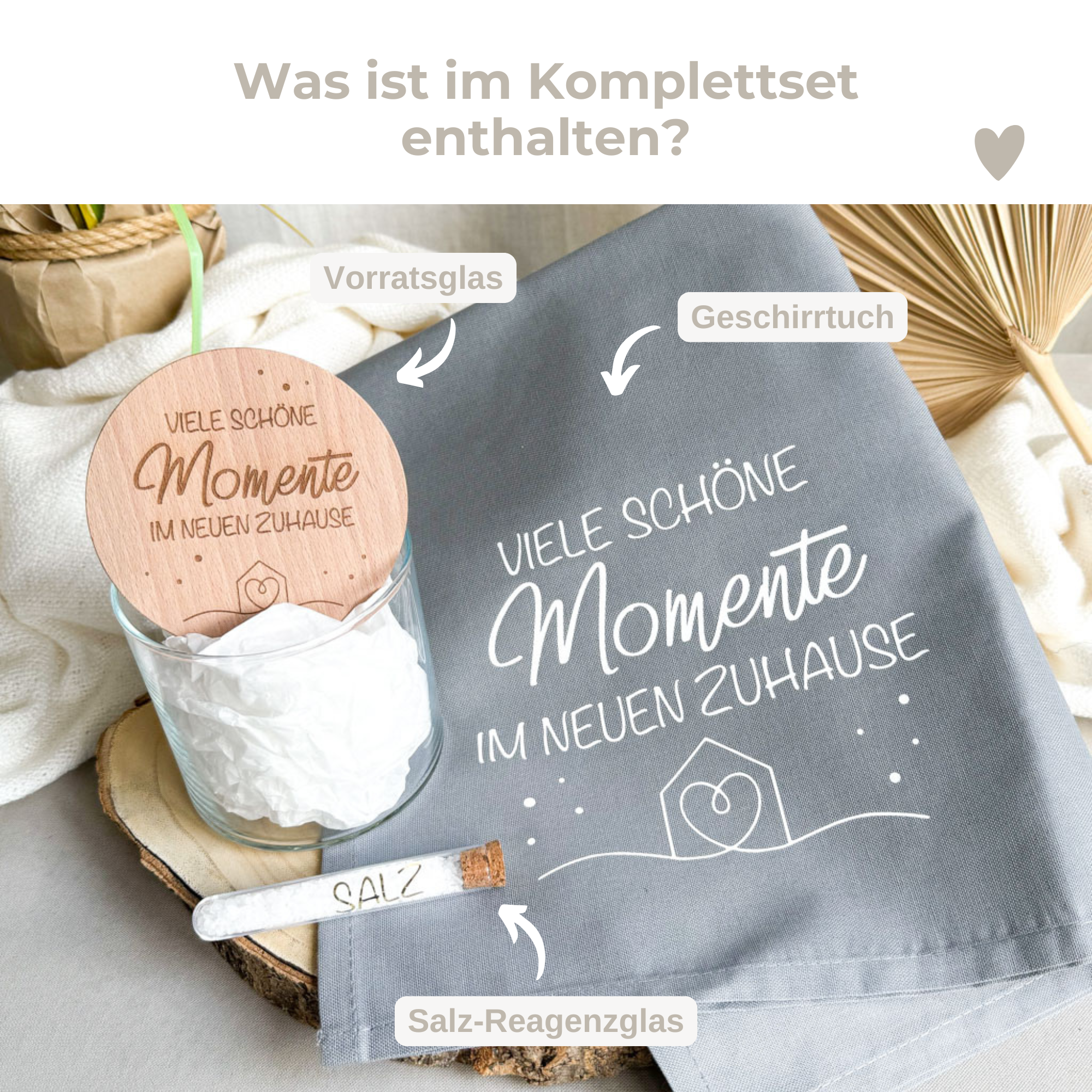 📍3tlg. Komplettset ( du bekommst das Geschirrtuch, das gravierte Vorratsglas und das Reagenzglas mit Salz gefüllt)