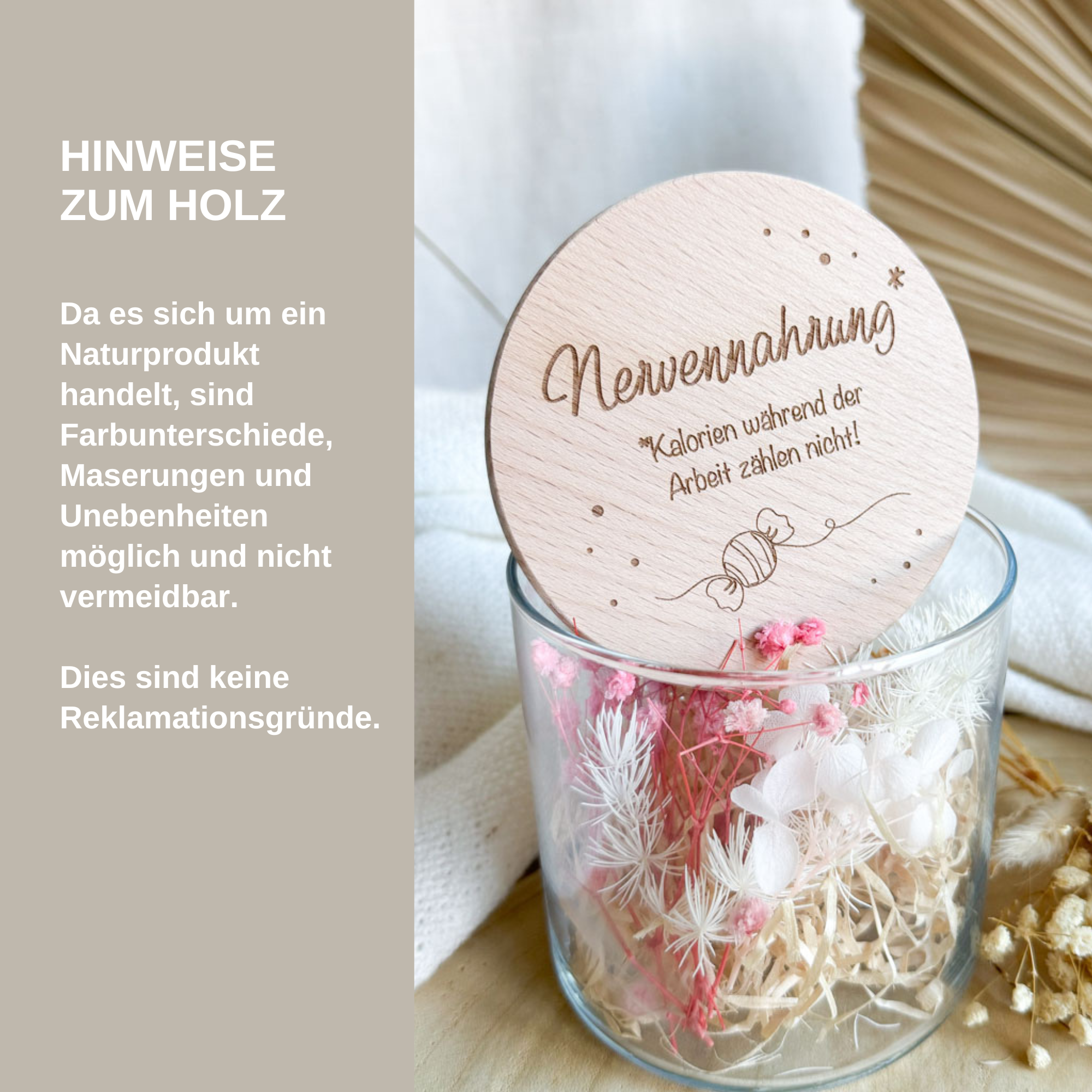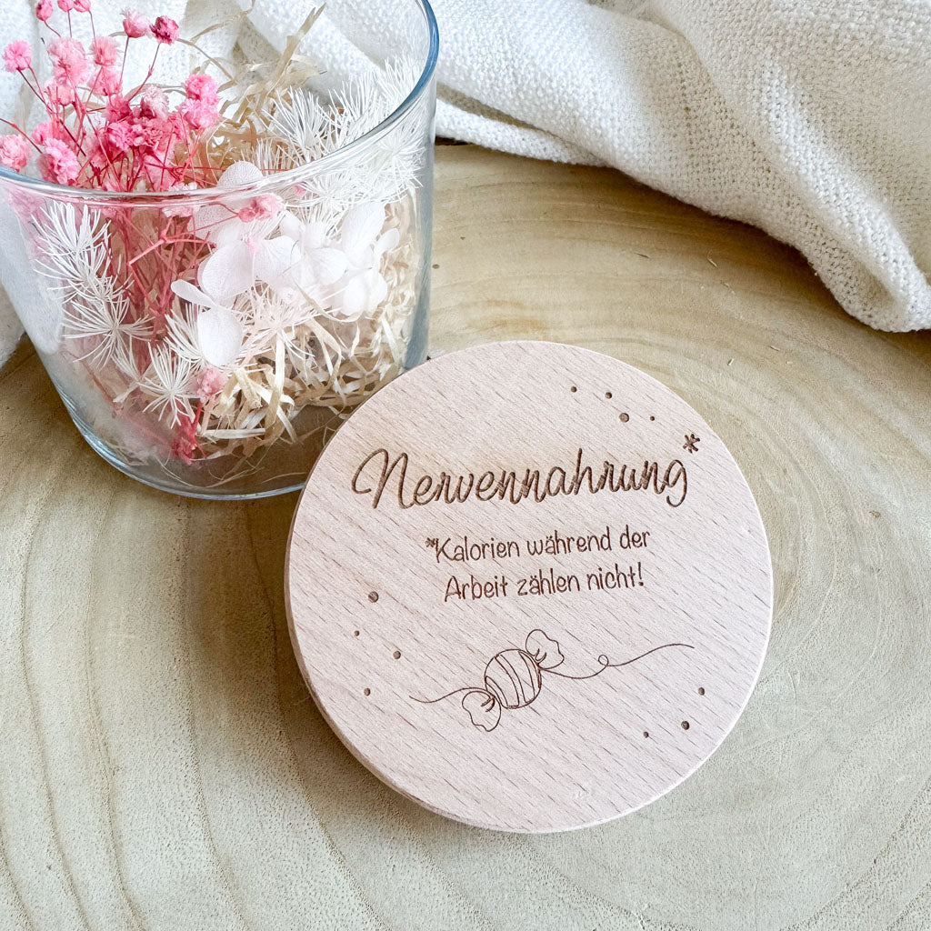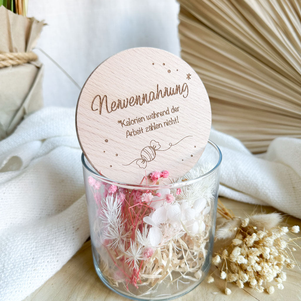 Manchmal braucht man einfach eine kleine Auszeit und ein bisschen Nervennahrung – genau dafür ist dieses Glas gemacht! Ob im Büro, im Homeoffice oder im Alltag – unser graviertes Vorratsglas mit dem liebevollen Spruch „Nervennahrung – Kalorien während der Arbeit zählen nicht!“ zaubert garantiert ein Lächeln aufs Gesicht.