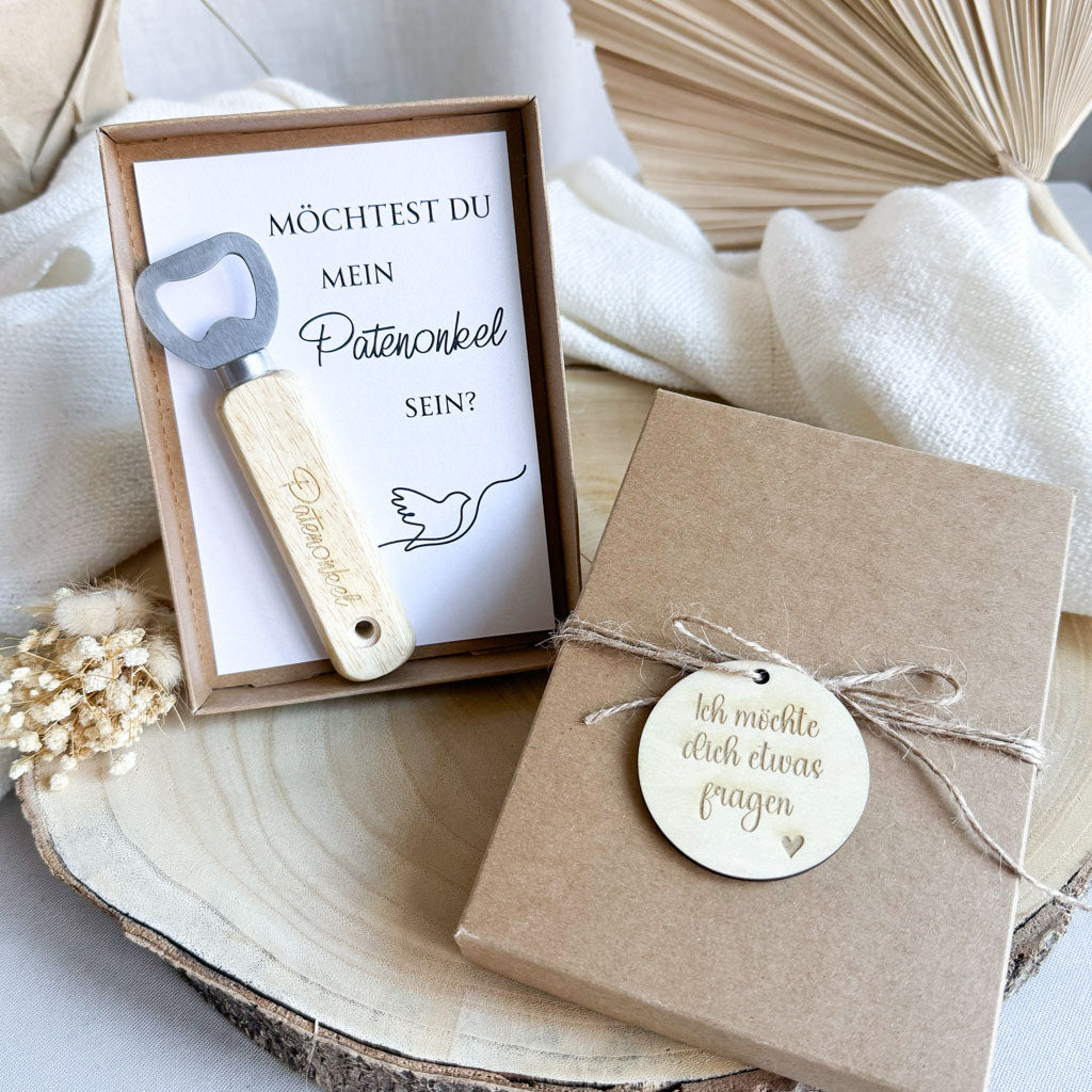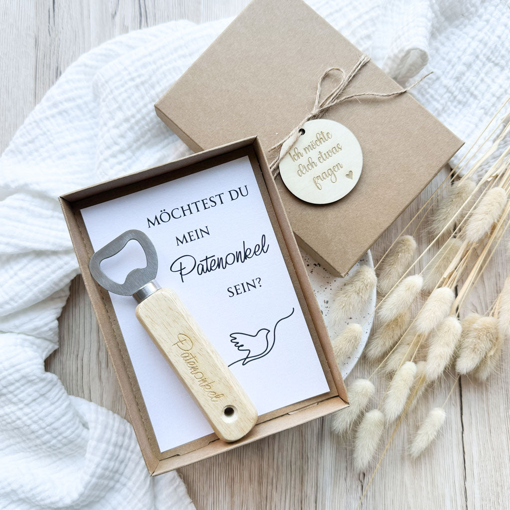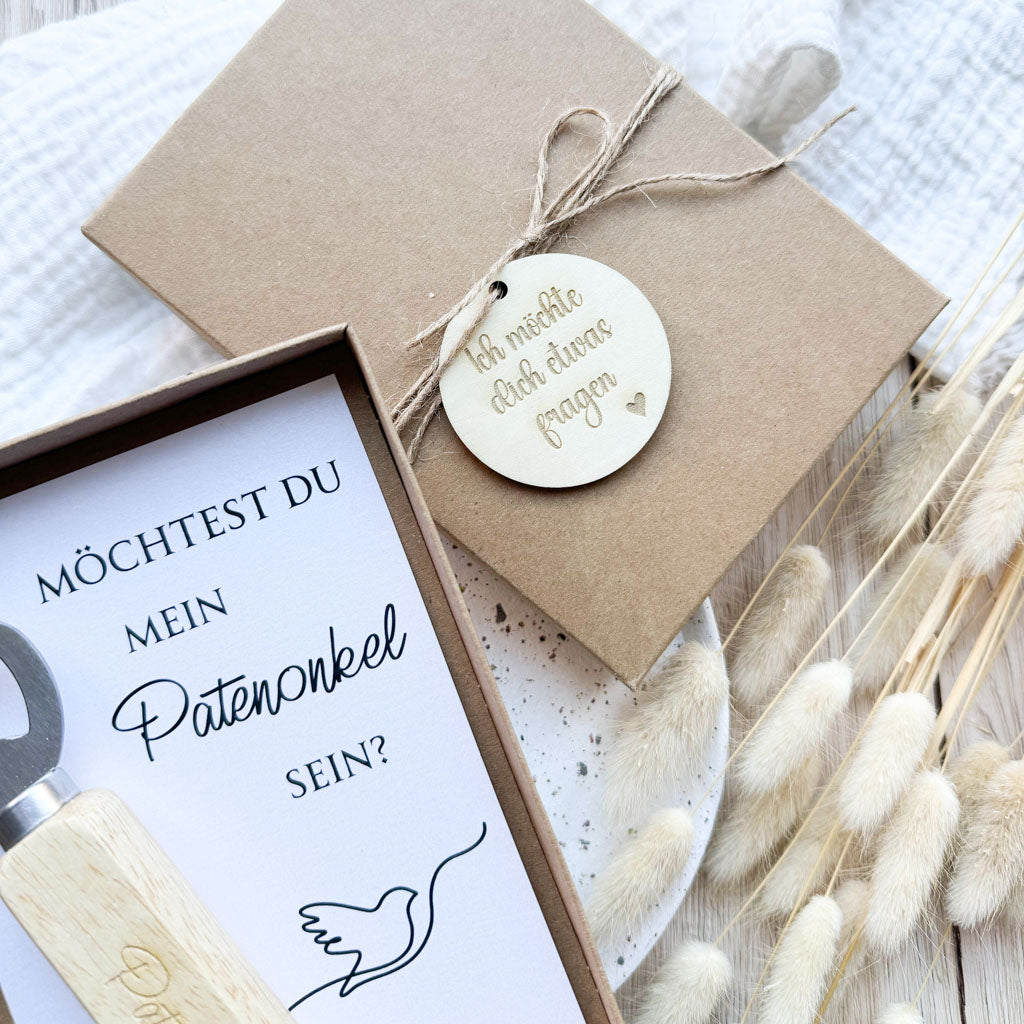 Verpackt wird der Flaschenöffner in einer hochwertigen Kraftpapierschachtel, die mit einer Jutekordel und einem Holzanhänger und der Gravur "Ich möchte dich etwas fragen" verschlossen wird. Im Inneren befindet sich dann der Flaschenöffner und ein Einleger mit dem Aufdruck "Möchtest du mein Patenonkel sein?"