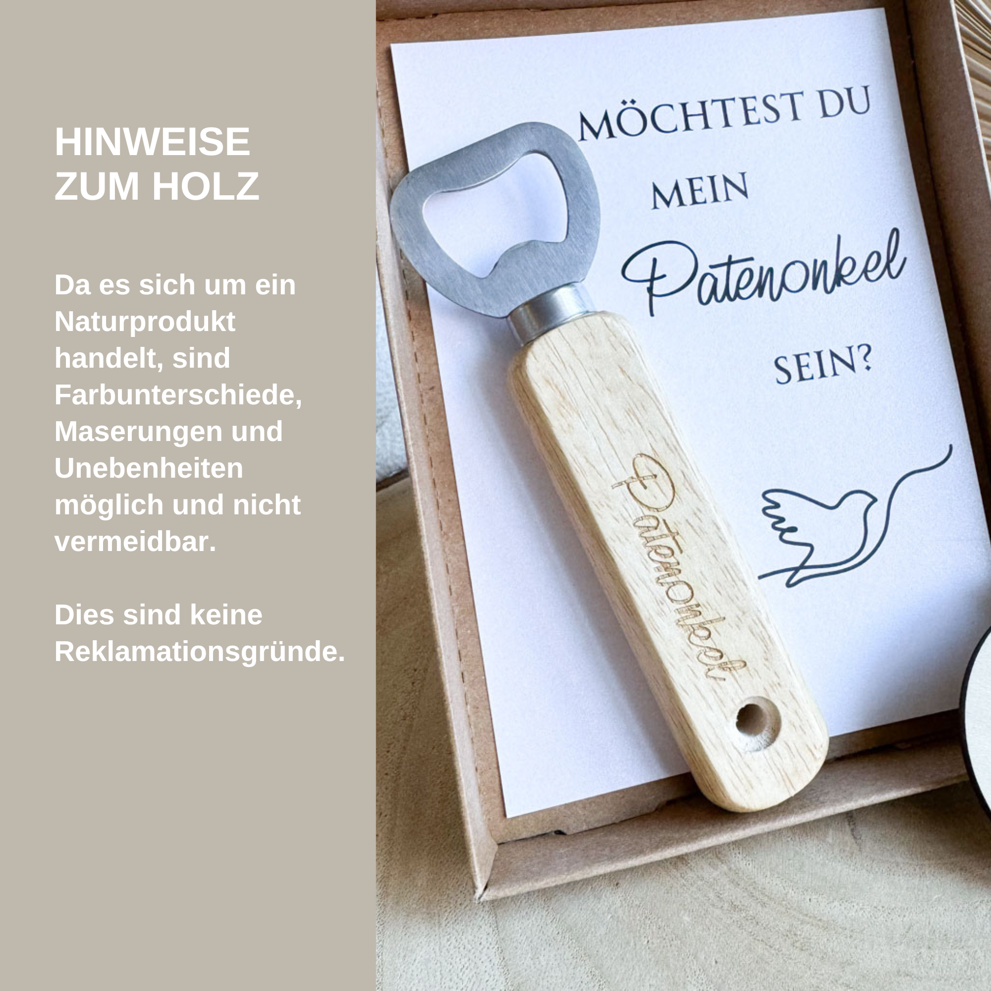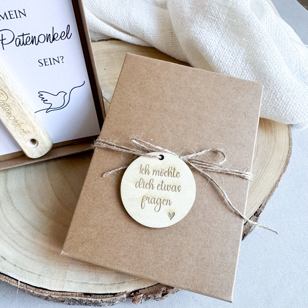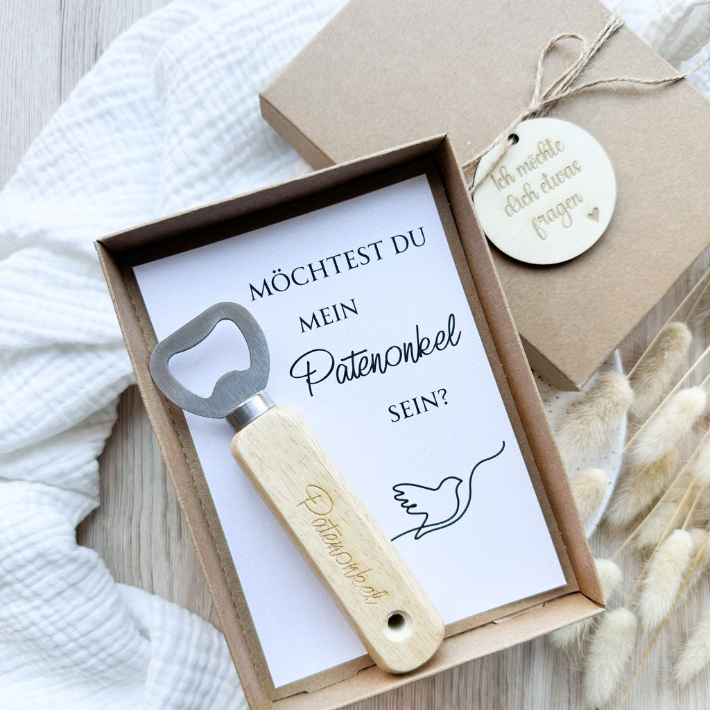 Verpackt wird der Flaschenöffner in einer hochwertigen Kraftpapierschachtel, die mit einer Jutekordel und einem Holzanhänger und der Gravur "Ich möchte dich etwas fragen" verschlossen wird. Im Inneren befindet sich dann der Flaschenöffner und ein Einleger mit dem Aufdruck "Möchtest du mein Patenonkel sein?"