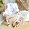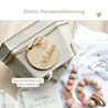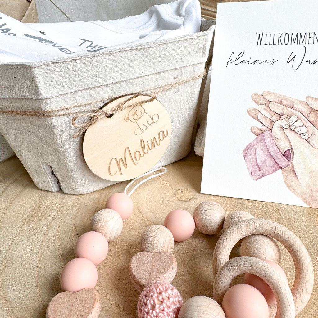 🎀 Verziert wird die Box mit einem Holzanhänger, auf dem der Name des Babys graviert wird – so wird jedes Geschenk zu einem einzigartigen Erinnerungsstück.