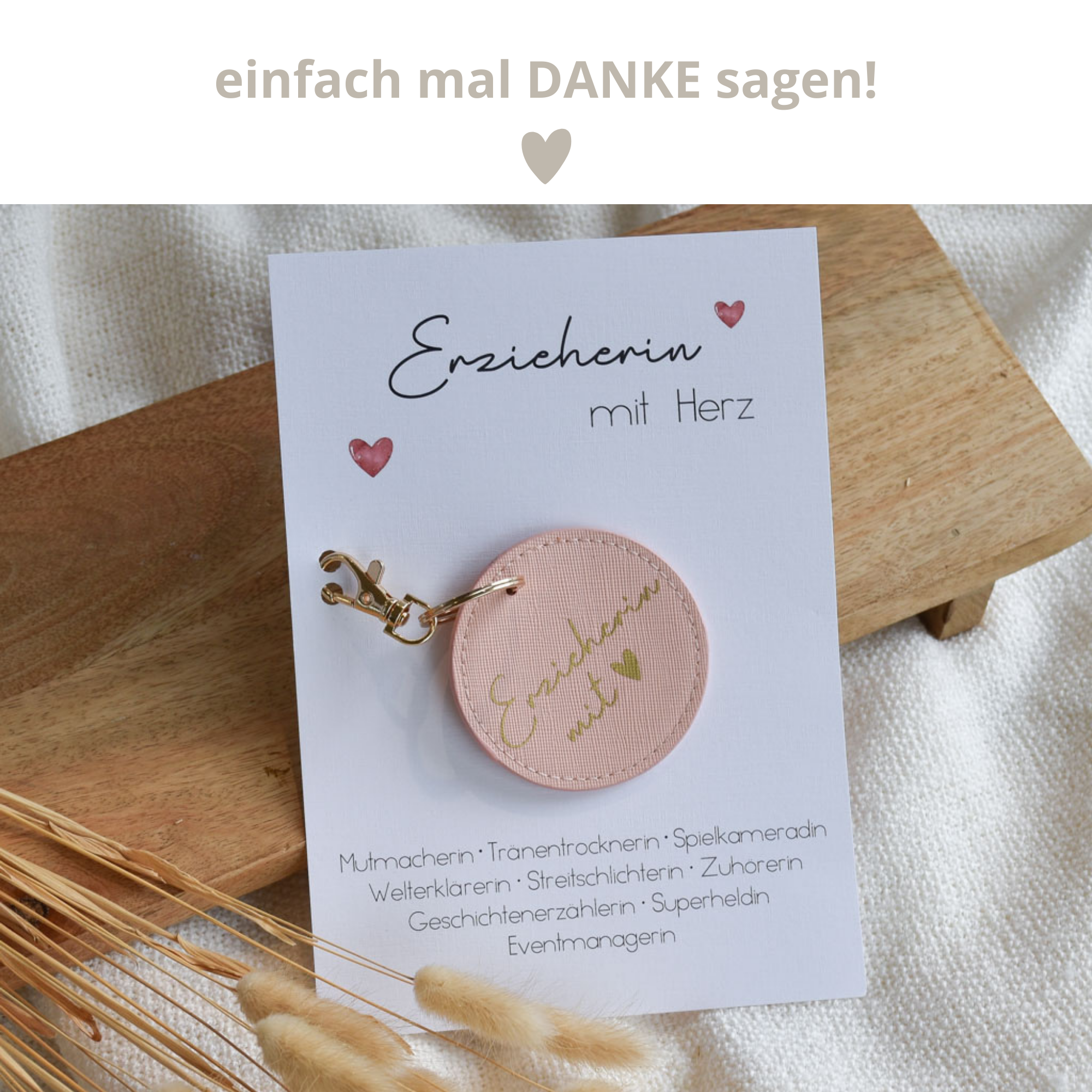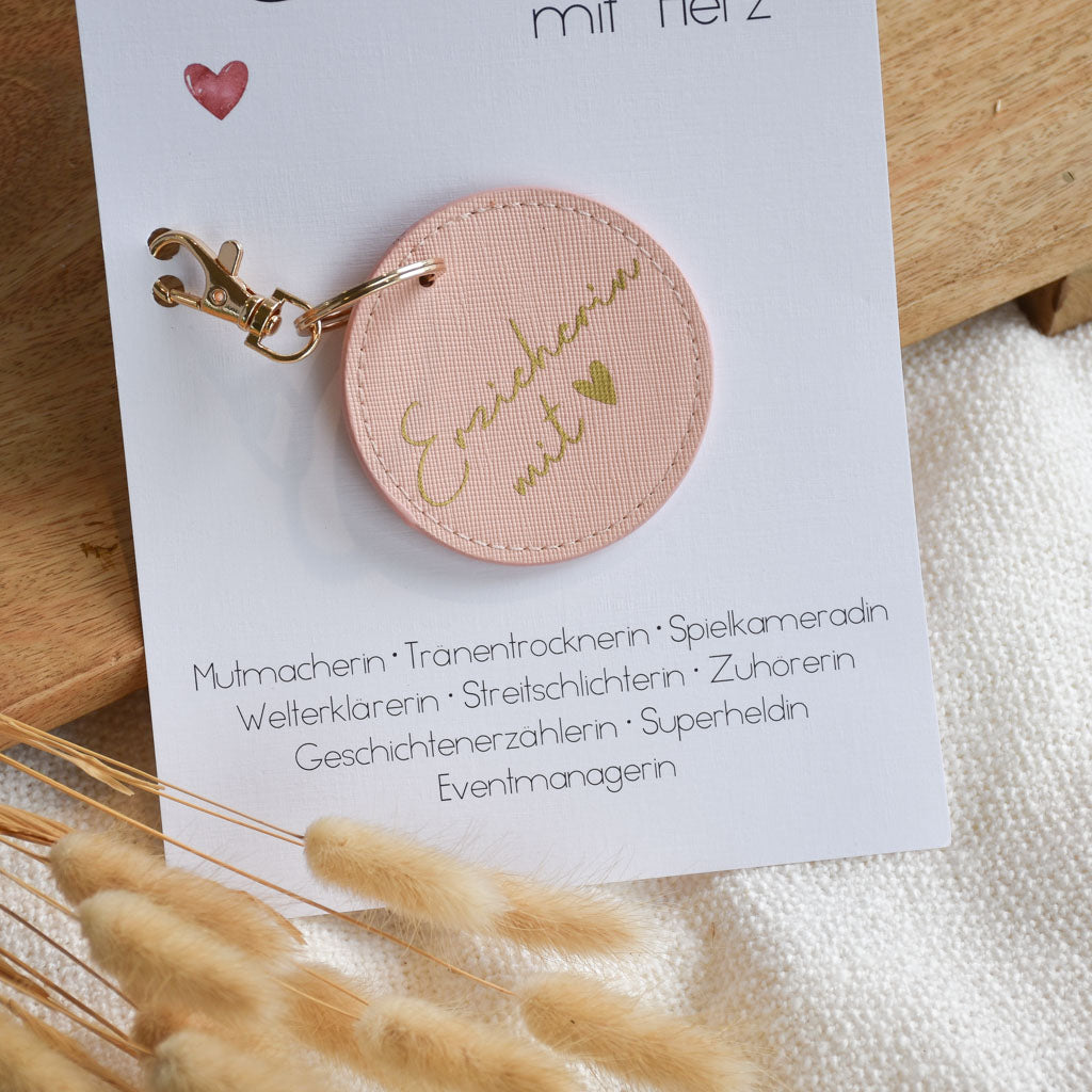 Der Schlüsselanhänger wird zusammen mit einer passenden Karte DIN A5 mit Leinenstruktur gestaltet und kann damit direkt an die Erzieherin übergeben werden.